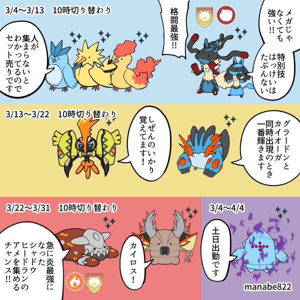 3月レイド! manabeyoh 11か月前 3/3 前 キュレム1コマ 4連!!3/2飛び跳ねるキュレムしびれるキュレム夕日…お前やってくれたな博士送りはスポアワで!!前次 次 明日は3ヶ月に1度のかけらを忘れたGBL勢を笑う日です!!3/4前